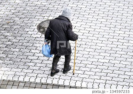日本の横浜都市景観 見えにくい段差や凹凸…高齢化社会…杖の高齢女性…冬至で冷え込む