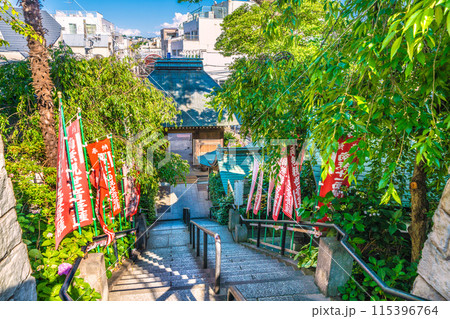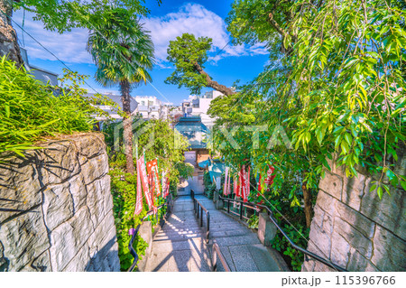 日本の横浜都市景観 6月。弘明寺駅前の商店街を抜けた先。弘明寺・階段などを望む