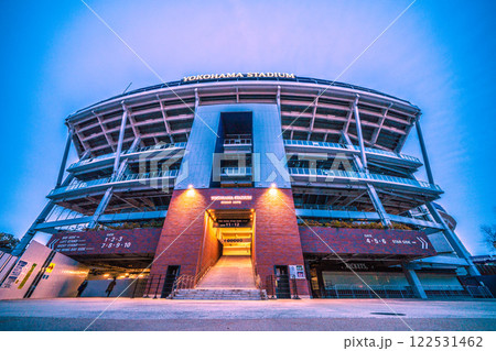 日本の横浜都市景観 横浜スタジアムなどを望む。試合が終わりスタジアムから出て来たファンら=14日