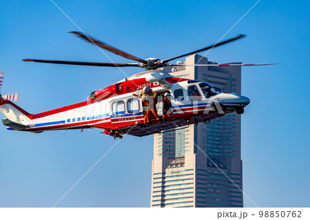 ランドマークタワーを背にヘリコプター旋回
