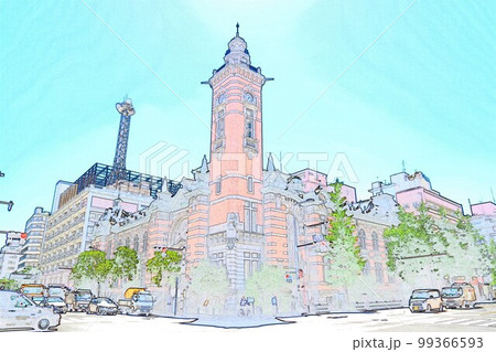 横浜開港50周年記念に建てられた横浜記念会館 旧開港横浜会館 絵画風イラスト2