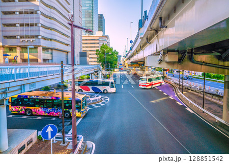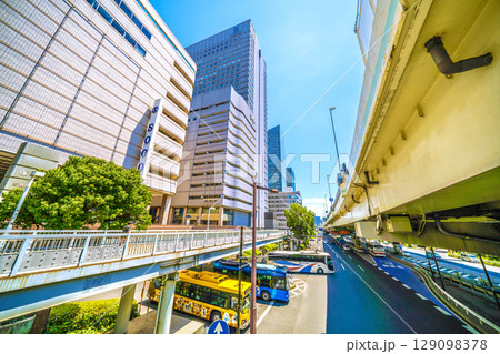 日本の横浜都市景観 横浜駅前。東口ロータリー出口や首都高ETC専用入口などを望む