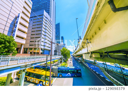 日本の横浜都市景観 横浜駅東口歩道橋から東口ロータリー出口や首都高ETC専用入口などを望む