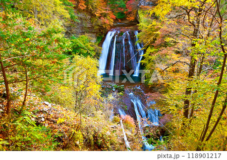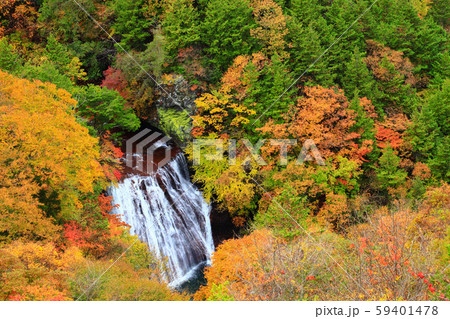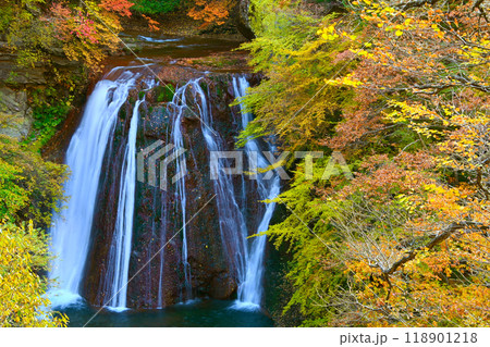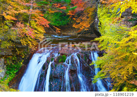 長野県蓼科高原 横谷観音展望台から見る紅葉の横谷渓谷と大滝