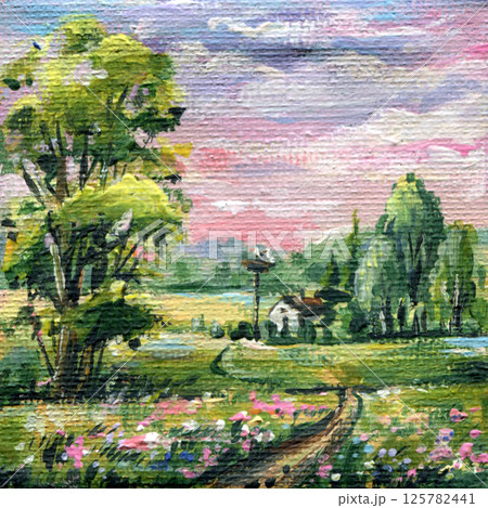 Spring landscape with trees, wildflowers, village house and stork nest at sunset. Rural acrylic painting.