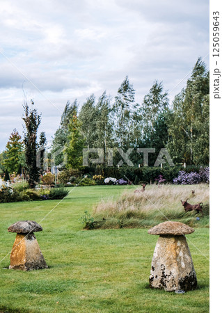 Two large mushroom-shaped stone sculptures placed on a manicured lawn within a landscaped garden featuring wild grasses and floral borders. Garden ornamentation, natural landscaping