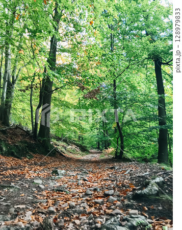 A forest path with a lot of leaves on the ground