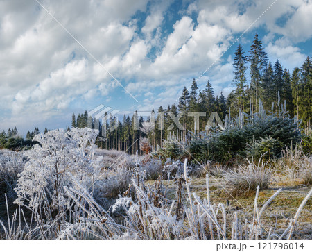 Winter coming. Last days of autumn, morning in mountain countryside peaceful picturesque hoarfrosted scene. Ukraine, Carpathian mountains.