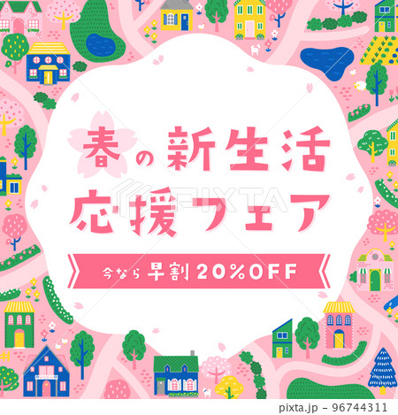 手描き 街並み(俯瞰)のフレーム・背景素材/サンプル文字入り(正方形)