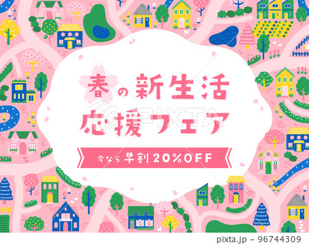 手描き 街並み(俯瞰)のフレーム・背景素材/サンプル文字入り(バナー向け横長)