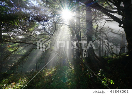 新緑輝く森の中と木漏れ日(癒し・マイナスイオン・エコ・環境)