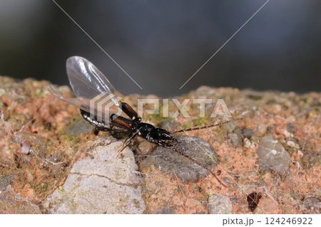 生き物 昆虫 ヒラタハネカクシ、お腹が丸出し。後翅を畳むとハサミムシのようにも見えます