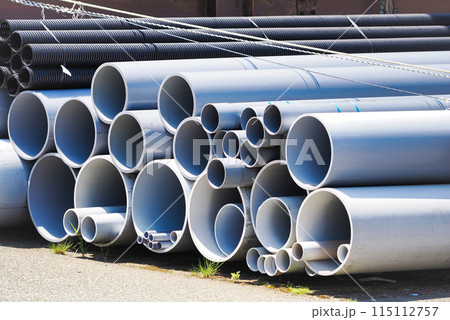 大小さまざまなサイズの積み上げられた塩ビパイプ