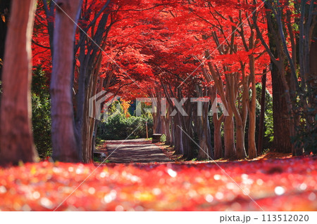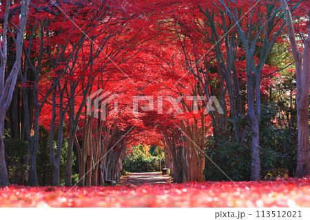 平岡樹芸センター「もみじトンネル」と落葉の赤い絨毯。木漏れ日の光が、赤く通路を染めている。