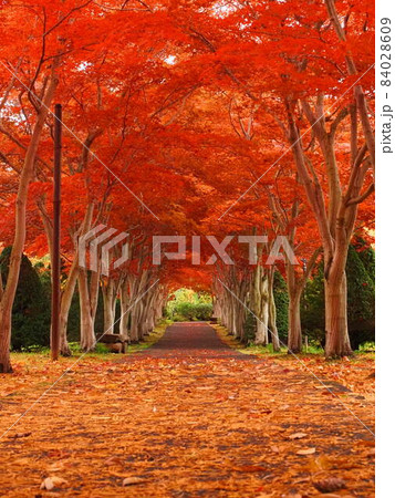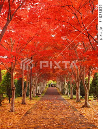 札幌10月秋のイメージ 平岡樹芸センターの紅葉トンネル 赤と緑の対比が美しい
