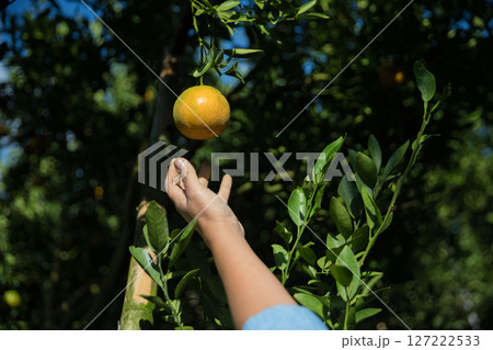 Business farm ripe orange concept farmer hand pick nature fruit citrus orchard mandarin tree growing organic lush leaves background green vibrant garden crop leaf laden branches plant close up growth