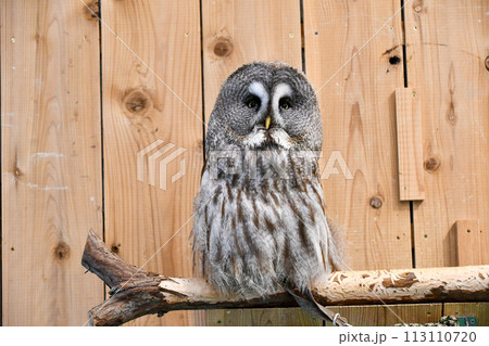 Great grey owl sleeps sitting on a branch. A sleeping Owl at the zoo