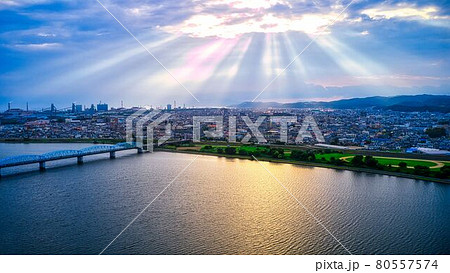 雲の隙間から幻想的な陽の光線が差した和歌山市の紀ノ川の河口の景色をドローンで空撮