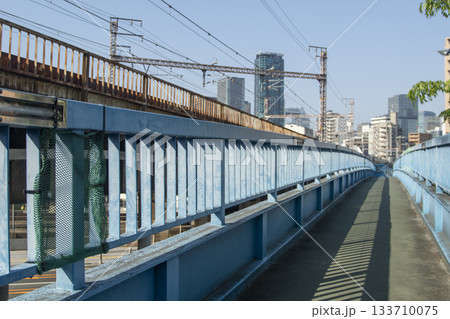 都会の高架鉄道と青い歩道橋の近未来的な風景