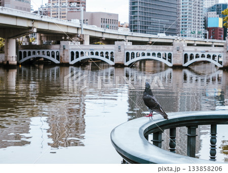 水辺の手すりに佇む鳩と歴史的な橋のアーチ