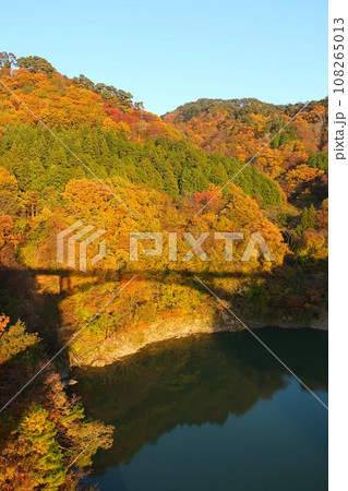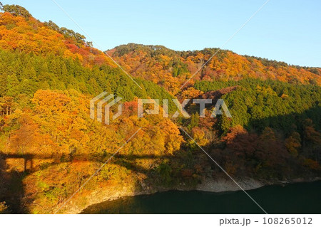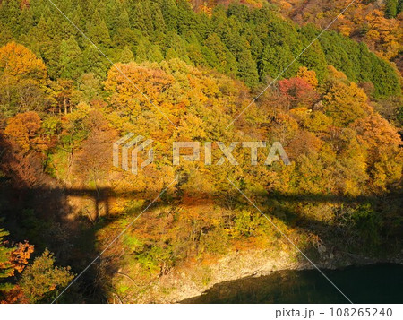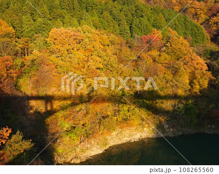 新潟県 関川村 丸山大橋からの橋の影と紅葉風景