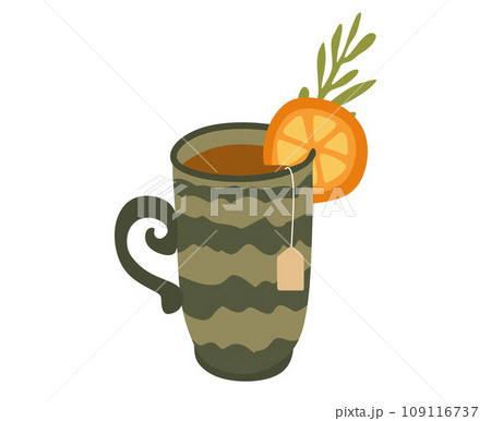 Cup with tea, Sliced orange, rosemary and spices, hot drink on a cold day. Herbal Autumn tea with teabag in porcelain or ceramic mug. Seasonal Isolated vector illustration in flat cartoon design.