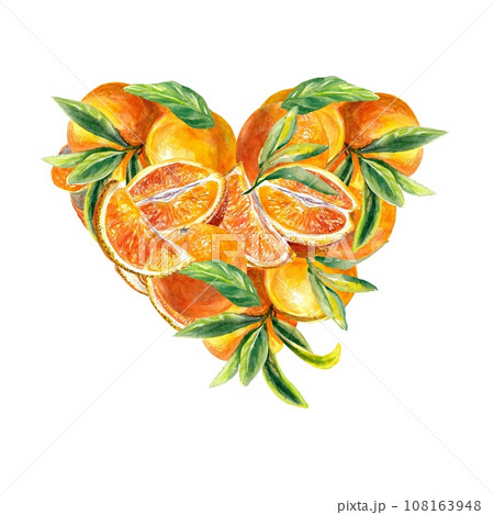 Heart of bright fruits of oranges. Watercolor illustration isolated on white background. Juice labels, food packaging, covers, cards, invitations.