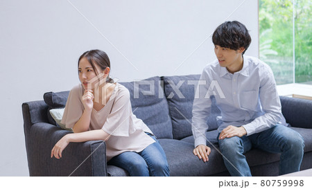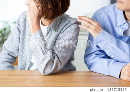 ご立腹の妻の機嫌を取るミドルの男性 日本人の夫婦