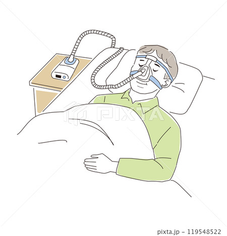 睡眠時無呼吸症候群の治療用器具をつけて寝ている中年男性