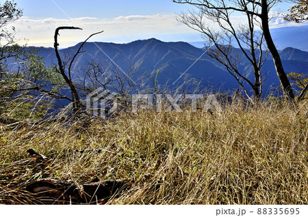 丹沢・檜洞丸から見る晩秋の山並みと御正体山と南アルプス