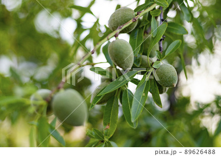 Almonds. Almond trees with green almonds hanging on the tree branches in the parks of Madrid, in Spain. Europe. Horizontal photography.