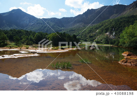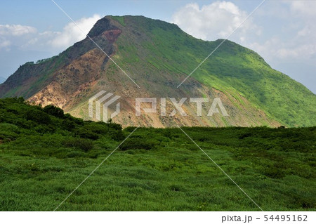 新緑の福島県 裏磐梯高原のるり沼入口から櫛ヶ峰、磐梯山方面