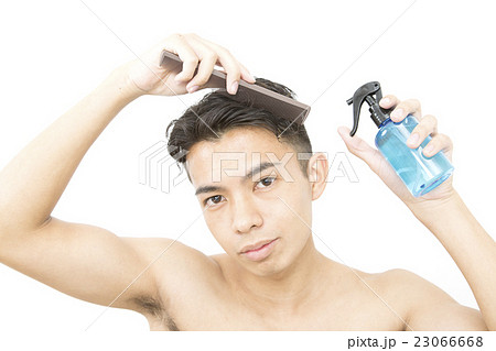 メンズビューティ 整髪 ヘアースタイルを整える 寝ぐせ直し カメラ目線 白バック