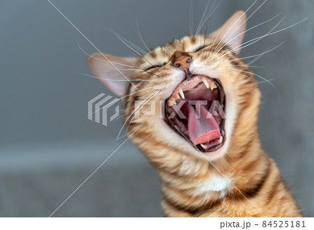 Bengal cat yawns on blurred background in room