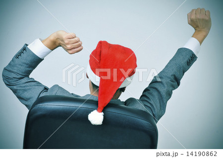 man with a santa hat stretching his arms in his office chair