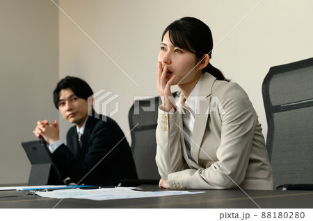 ビジネスセミナー あくびをするノートパソコンを前に聴講中の若い男性