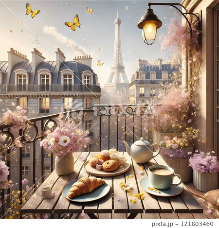 Parisian Cafe Scene: Steaming Coffee Cups and Cityscape View Thr