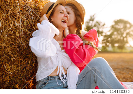 Two young women having fun near haystack. Fashion concept. Summer concept.