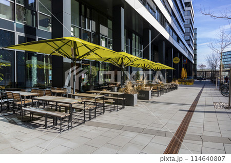 Empty bistro tables and chairs along cobblestone street in cesky krumlov