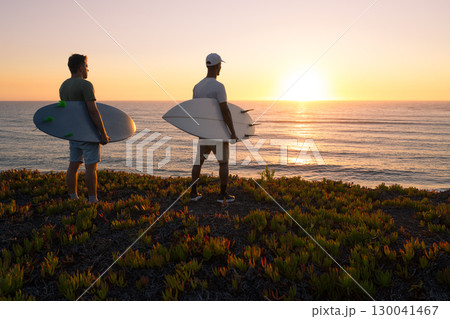Lisbon, Portugal: Golden waves washing sandy beach, orange sun light reflecting on water, tourists people enjoying sunset over Atlantic Ocean, creating idyllic scene. Summer travel vacation background