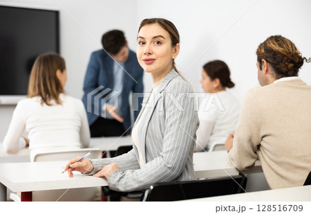 Positive casual female sitting at desk during business trainings with group of people in auditory