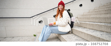 Portrait of young girl traveller, sitting with backpack and map of city, working on laptop, connecting to public wifi and sitting on stairs outdoors, using internet to book hotel room