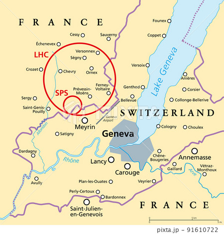 Large Hadron Collider (LHC) and Super Proton Synchrotron (SPS), political map. Position of worlds largest and highest-energy particle collider near Geneva beneath the border of France and Switzerland.