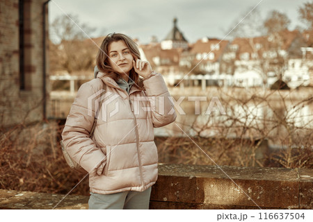 Young beautiful pretty tourist girl in warm hat and coat with backpack walking at cold autumn in Europe city enjoying her travel in Bietigheim-Bissingen, Deutschland. Outdoor portrait of young tourist