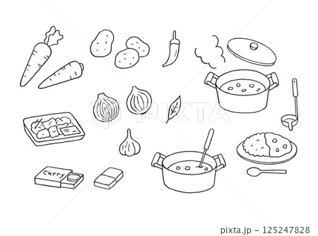 カレーライスとカレーの材料の手描きイラストセット(モノクロ)