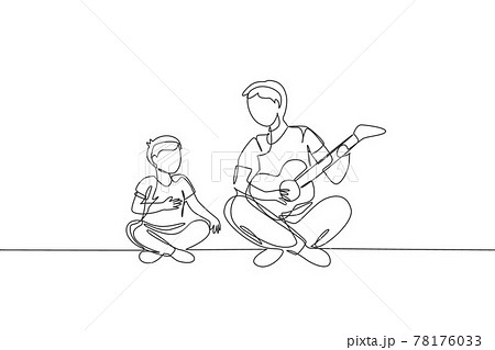 One continuous line drawing of young dad playing guitar and happy singing together with his son at home. Happy family parenthood concept. Dynamic single line draw design vector graphic illustration