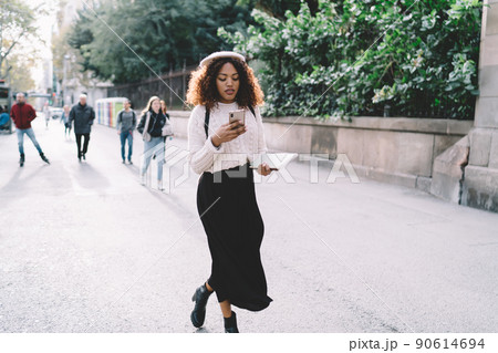 Confident ethnic woman with smartphone walking on street