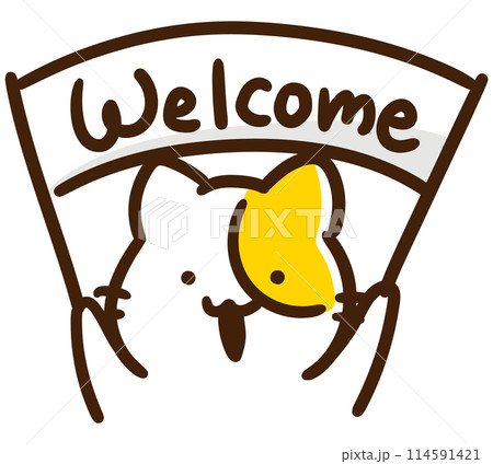 Welcomeの弾幕を掲げるかわいいねこのキャラクターのデフォルメイラスト