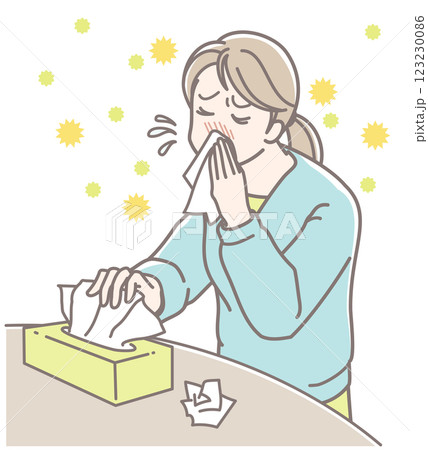 花粉症で鼻水が止まらず、鼻をかむ女性のイラスト