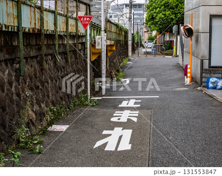舗装工事後の路面に書かれた道路標示と補助線の跡 止まれ b-2 高コントラスト